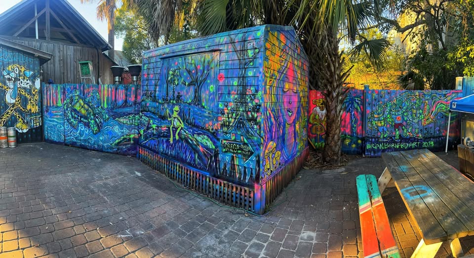 If you’ve been to Fernandina’s famous Green Turtle, you’ve probably already seen Brian’s work — the murals wrapping around the venue’s fences are his. It’s become part of the place, and for a lot of people it’s the first introduction to what he does.